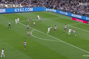 迪亚斯左路传中,贝林厄姆前插垫射稍稍偏出球门!