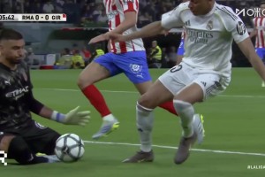 可惜!卡马温加送长传,姆巴佩前插停球稍大被门将出击解围!