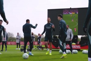 阿森纳在训练中一边播放短视频一边训练😂