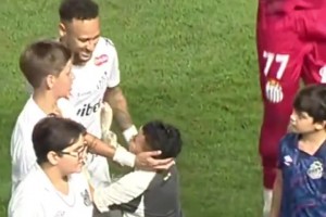 实拍:桑托斯队的一名小球童亲吻了内马尔的腿,好可爱啊