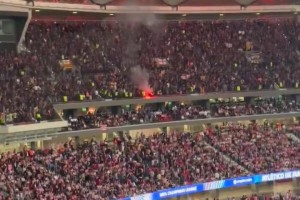 巴萨球迷区因进球庆祝点燃焰火,安保火速出动将其扑灭