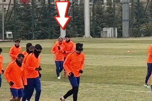 山东泰山队赛前训练,高准翼搂着黄政宇比耶拍照