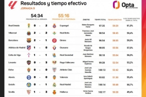体育资讯10月21日讯OPTA统计了西甲第九轮各场比赛的有效时间,没有任何一场比赛的有效时间超过60分钟。西甲第9轮各场比赛有效时间:皇家奥维耶多0-2西班牙人,比赛时间97分35秒,有效时间59分29
