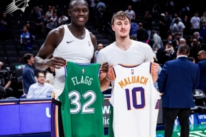 体育资讯11月13日讯NBA常规赛,独行侠主场114-123不敌太阳。赛后,独行侠状元秀弗拉格和太阳首轮10号秀马卢阿奇交换球衣。此役,弗拉格全场打了33分42秒,15投6中(三分7中3)、罚球4中1,