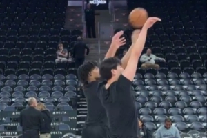 体育资讯10月30日讯NBA常规赛,开拓者客场挑战爵士。赛前,杨瀚森和队友夏普一起进行三分投篮热身。GIF-杨瀚森和夏普三分热身