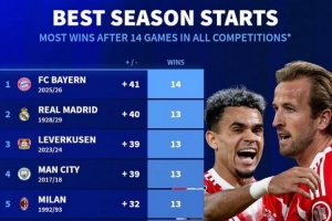 体育资讯10月31日讯拜仁在昨晚德国杯4-1逆转科隆,赛季开局各项赛事14场全胜打破五大联赛球队历史纪录,《转会市场》也统计了五大联赛球队历史单赛季各项赛事前14场的胜场情况。德转列五大联赛球队赛季开局